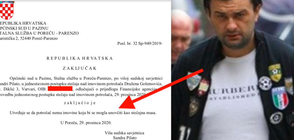 Zato je sutkinja Sandra Pilato istoodbno otvorila i zaključila osobni stečaj na Draženom Golemovićem u Poreču, 29. prosinca prošle godine. Prema podacima iz posjedovnog lista Dražen Golemović je upisan kao vlasnik luksuzne vile s bazenom u Stanciji Diklići pokraj Poreča. No, posjedovni list nije dokaz vlansištva a za istu nekretinu nije moguće utvrditi vlasništvo preko e-izvatka. Činjenica je da su sve tvrtke preko kojih je proteklih desetljeća Golemović vodio svoj nekretninski biznis - gradnju luksuznih vila u Istri i Opatiji, otišle u stečaj.