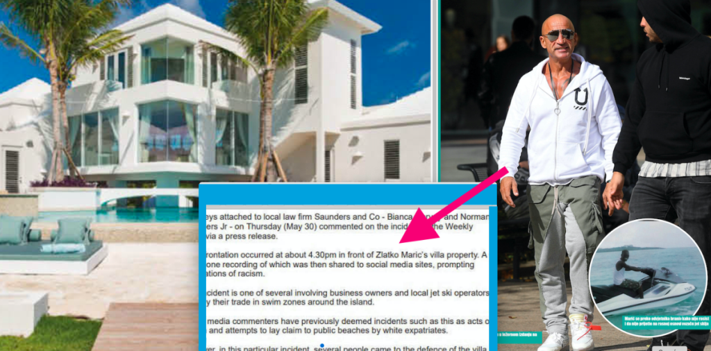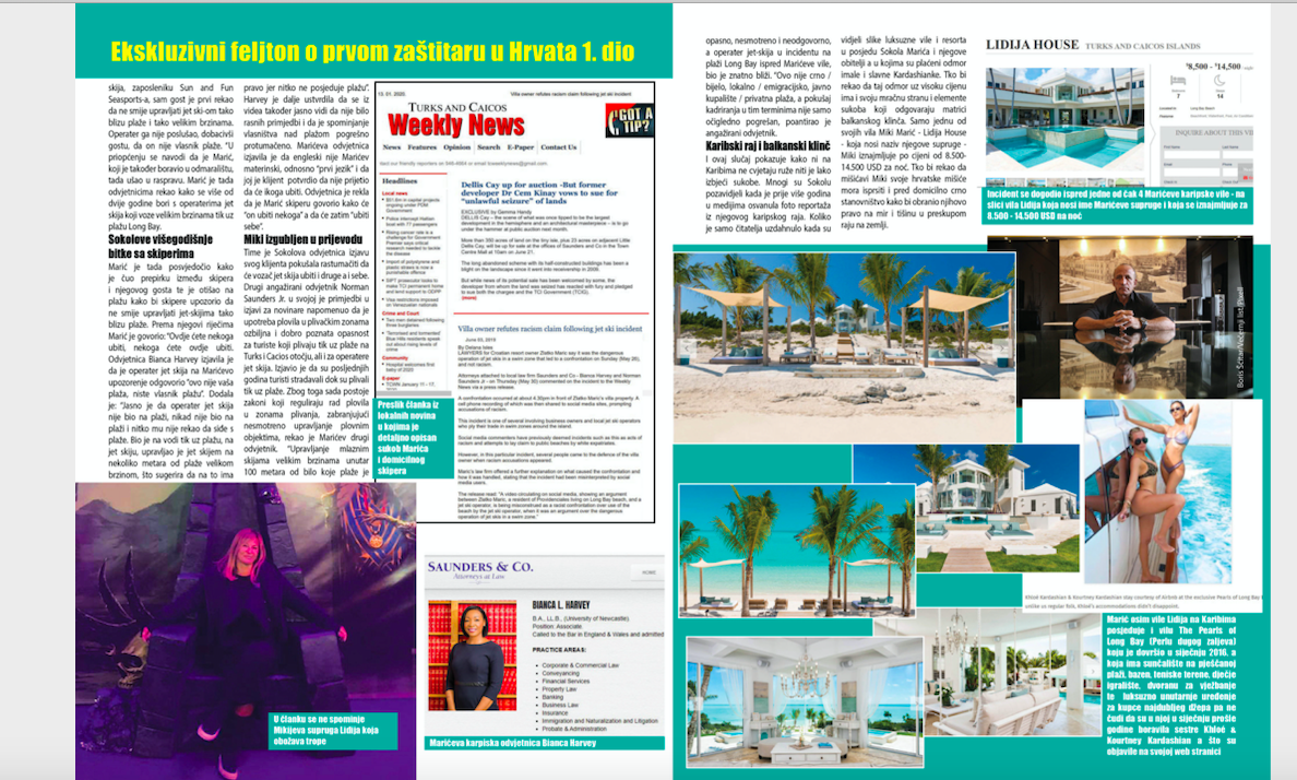 Naslovom članka je glasio: "Vlasnik odbacuje tvrdnju o rasizmu nakon incidenta na jet skiju". Članak se bazirao na izjavama Zlatka Marića, najpoznatijeg zaštitara u Hrvata. U članku je tamatiziran obračun koji se u tropskom raju dogodio 26. svibnja 2019. kada je jet skijaš doplovio neposredno uz plažu vile Sokola Marića. Odvjetnici su tvrdili kako Marić nije prijetio ubojstvom vozaču jet skija i da rasizam nije bio u temelju incidenta. Vlasnik zaštitarske tvrtke angažirao je odvjetnike iz tvrtke Saunders&Co i to Biancu Harvey i Normana Saunderas Jr. Oni su u 30. svibnja 2019. poslali medijima priopćenje za javnost u kojem su iznijeli Marićevu verziju događaja.
