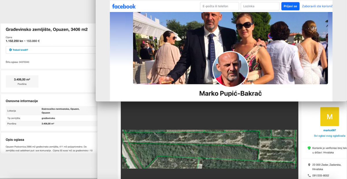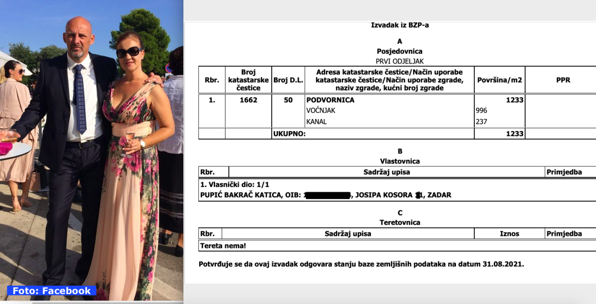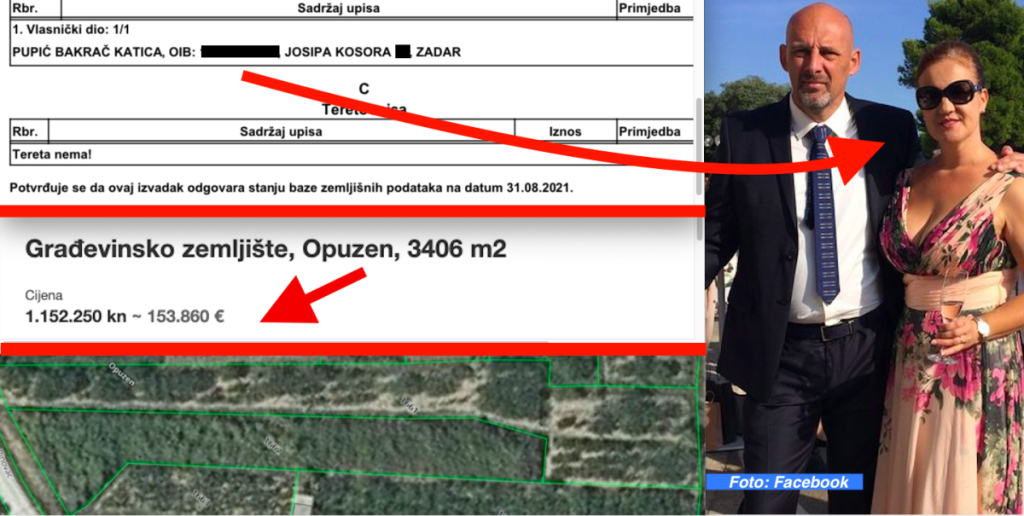 Provjerili smo u zemljišnim knjigama i otkrili kako jedna atraktivna parcela glasi na njegovu suprugu Katicu Pupić Bakrač. Iz vlasničkog lista vidljivo je kako na zemljištu u Opuzenu, točnije u ulici Pinovac, nema nikakvog tereta. Očito je izvanknjižna vlasnica i susjednih parcela jer je i te označio Pupić Bakrač u oglasu iako oni glase na drugu osobu. Očito Pupić Bakrač ima tajni recept kako istodobno biti teleportiran u inspektorat, zadarsku županijsku vijećnicu, medije, a usput uspijeva biti i prva njuška među Njuškalo oglašivačima.