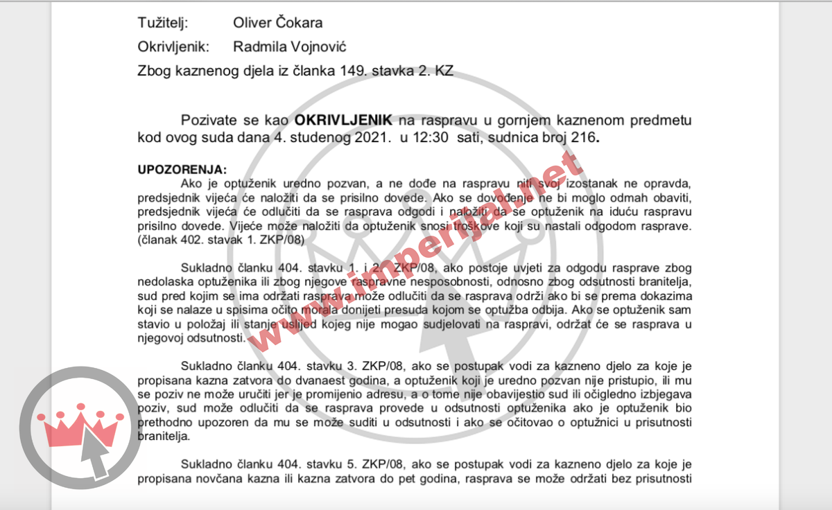 Pozvana je zbog kaznenog djela iz članka 149. stavka 2. KZ-a. Na sud je kao okrivljenica pozvana 4. studenog 2021. kod sutkinje Jasne Rađenović koja je u pozivu ispisala sljedeće: 'Ako je optuženik uredno pozvan, a ne dođe na raspravu niti svoj izostanak ne opravda, predsjednik vijeća će naložiti da se prisilno dovede. Ako se dovođenje ne bi moglo odmah obaviti, predsjednik vijeća će odlučiti da se rasprava odgodi i naložiti da se optuženik na iduću raspravu prisilno dovede. Vijeće može naložiti da optuženik snosi troškove koji su nastali odgodom rasprave. (članak 402. stavak 1. ZKP/08). Sukladno članku 404. stavku 1. i 2. ZKP/08, ako postoje uvjeti za odgodu rasprave zbog nedolaska optuženika ili zbog njegove raspravne nesposobnosti, odnosno zbog odsutnosti branitelja, sud pred kojim se ima održati rasprava može odlučiti da se rasprava održi ako bi se prema dokazima koji se nalaze u spisima očito morala donijeti presuda kojom se optužba odbija.