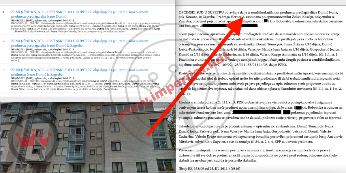 Iz navedenog se vidi da su tražili da se sudu javi u dobi od 127 godina. Nakon isteka tri mjeseca tražitelj uknjižbe mogao je pristupiti postupku upisa vlasništva. Provjerom smo utvrdili kako se tražila uknjižba na parcele koje su u vlasničkom listu bile upisane kao: šuma, 4 pašnjaka, vinograd i vrt. U vlasničkom listu bili su upisani redom: Buzolić Stipan i Buzolić Ante sinovi Marka, Poklepović Jerka žena Nikole, Bonačić Lovretović Kata žena Nikole, Poklepović Lukra žena Josipa i Poklepović Jerka žena Nikole te Poklepović Nikola. Podsjetimo kako je to izgledalo u stvarnosti kada netko pokrene spor te se nakon proglašenja mrtvim i u odsutnosti uknjiži na imovinu iseljenih ili sudu nedostupnih osoba. O tome je svjedočio slučaj Ivane Domić. U ožujku 2017. objavljeno je kako je bivša predsjednica Općinskog suda u Supetru nepravamoćno oslobođena krivnje. Nju se teretilo da je počinila više kaznenih djela utvrđivanja vlasništva i uknjižbe zemljišta, oštetivši mnoge Bračane za oko 75 milijuna kuna.