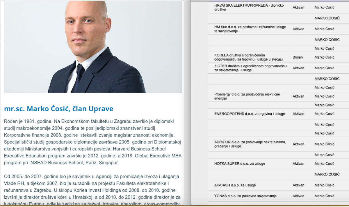 Prije nekoliko dana objavili smo članak o sinu generala Krešimira Ćosića, članu Uprave HEP-a. Radi se o 40-godišnjem poduzetniku koji je prije ulaska u krug najmoćnijih HEP-ovaca zanat ispekao radeći za kontroverznog ukrajinskog poduzetnika koji je nekoliko godina proveo iza rešetaka a teretilo ga se čak i za ubojstvo te niz drugih nezakonitosti. Marko Ćosić podatak o angažmanu za tvrtku Korlea koja je vlasništvo tog Ukrajinca ističe na službenim stranicama HEP-a. Doduše tamo ne navodi podatak kako je od 2008. do 2012. radio za Korleu ali spominje i poslovni angažman za Pronergy od 2012. do 2017. godine.