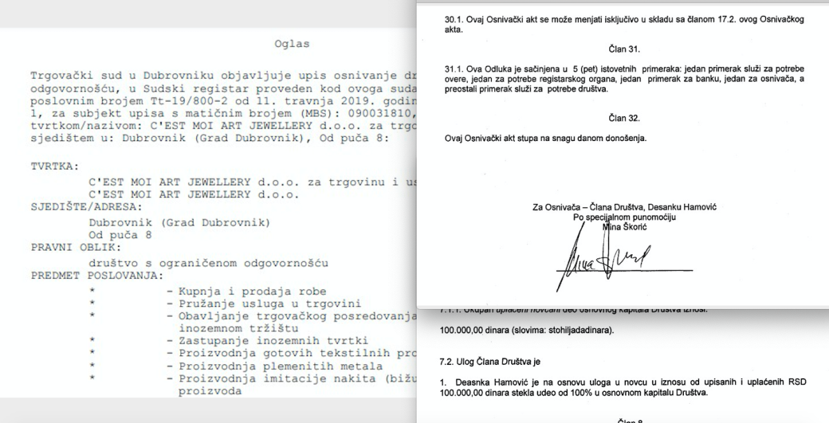 Uvijek je isti kontekst - kako je neki korumpirani direktor državne energetske kompanije pogodovao njihovim tvrtkama prigodom sklapanja ugovora o kupnji električne energije a onda potom sve splasne i sve se gurne pod tepih. No, milijuni koji su zarađeni na energetskim poslovima oplemenjuju se i kroz druge unosne biznise U slučaju Vuka Hamovića radi se o draguljarskom biznisu koji formalno vodi njegova supruga Desanka. Ona je naime u srpnju 2012. na kućnoj adresi u beogradskoj Balkanskoj ulici osnovala tvrtku zvučnog imena C'est Moi Art Jewellery. Direktorica te tvrtke je Beograđanka Mina Škorić koja je u Hrvatskoj, odnosno Dubrovniku, otvorila tvrtku istog imena. Ta dubrovačka tvrtka posluje od travnja 2019. isprva na adresi Od puča 8 a sada na adresi Vukovarska 30 u Dubrovniku.
