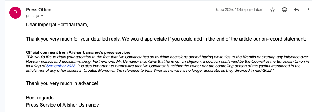 Nakon objave članka zaprimili smo službeni komentar press službe Alishera Usmanova koji u nastavku citiramo: "Željeli bismo skrenuti vašu pozornost na činjenicu da je g. Usmanov u više navrata negirao bliske veze s Kremljem ili bilo kakav utjecaj na rusku politiku i donošenje odluka. Nadalje, g. Usmanov tvrdi da nije oligarh, što je potvrdilo i Vijeće Europske unije u svojoj presudi iz rujna 2023. Također je važno naglasiti da g. Usmanov nije ni vlasnik ni kontrolna osoba jahti spomenutih u članku, niti bilo koje druge imovine u Hrvatskoj. Štoviše, spominjanje Irine Viner kao njegove supruge više nije točno, jer su se razveli sredinom 2022."
