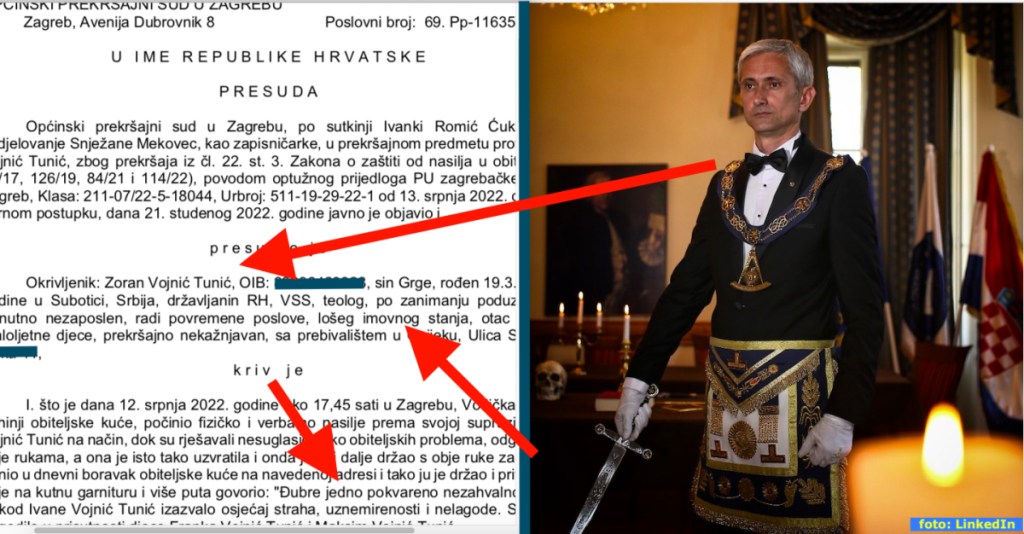 Na Općinskom prekršajnom sudu u Zagrebu sutkinja Ivanka Romić Ćukušić odlučivala je u prekršajnom predmetu protiv Zorana Vojnića Tunića, zbog prekršaja iz čl. 22. st. 3. Zakona o zaštiti od nasilja u obitelj. Optužni prijedlog podigla je PU zagrebačke, III. PP Zagreb 13. srpnja 2022. godine. U žurnom postupku 21. studenog 2022. godine presuđeno je kako je okrivljeni Zoran Vojnić Tunić kriv. Uz njegovo ime, među ostalim navodi 'kako je sin Grge, rođen 1973. godine u Subotici, državljanin RH, VSS, teolog, po zanimanju poduzetnik, trenutno nezaposlen, radi povremene poslove, lošeg imovnog stanja, otac ..... djece, prekršajno nekažnjavan, s prebivalištem u Osijeku'.