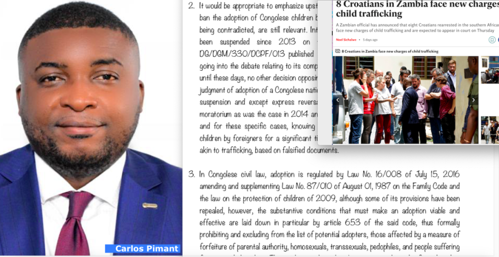 Pišući o slučaju osmero Hrvata koji se posvojili četvero djece iz DR Konga a koji se u Zambiji, gdje im se sudi za trgovinu djecom, citirali smo najčitaniji tamošnji portal Lusaka Times te predstavili članak odvjetnika Carlosa Pimanta objavljen na najčitanijem pravnom portalu Village Justice. Nakon objave tog članka poslali smo odvjetniku Pimantu upit i na njega dobili odgovor. U uvodu smo naveli kako ga kontaktiramo s 'hrvatskog portala imperijal.net vezano uz hrvatske državljane koji su u prosincu 2022. uhićeni u Zambiji, u zračnoj luci Ndola, pod optužbom za trgovinu djecom iz Konga'. Istaknuli smo kako smo pročitali njegov članak o uvjetima posvajanja djece iz Konga u kojem je on detaljno objasnio pravnu proceduru. Pitali smo ga: