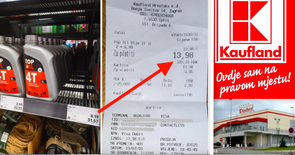 Sa sličnim problemom suoči se i jedan kupac koji je u Kauflandu u Splitu, u Ulici 114. brigade 6, kupio dva puta po 1 litar Top Oil ulja 2T i platio 13,98 eura, što znači po litri 6,99 eura, što je vidljivo na računu, a ispod cijene u eurima istaknuta je cijena u kunama u iznosu od 105,33 HRK. I ništa tu ne bi bilo čudno ni upadljivo da naš čitatelj nije prije kupovine tog ulja za brodske motore vidio na polici istaknutu cijenu od 4.19 eura za 1 litar ulja TOP OIL 2T. I tako je kupac dva litra tog ulja umjesto 8.38 eura platio skoro duplo više ili točnije 13.98 eura. Dakle 5.6 eura više. Što je previše, previše je. Poglavito što je cijena tog ulja prije poskupljenja dugo bila 27.99 kn i tek je 31. svibnja ove godine istaknuta cijena od 4.19 eura. Kupac je u splitskom Kauflandu uzeo dva zadnja pakiranja tog ulja što znači da su prije njega brojni kupci nasjeli i napunili Kauflandovu blagajnu a svoj džep ispraznili za skoro 3 eura po litri.