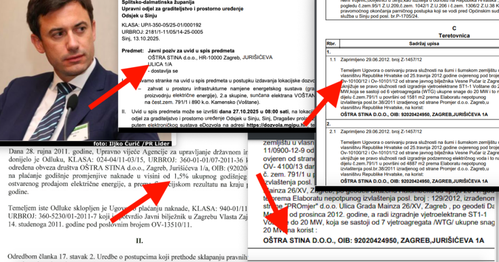 Taj je dokument dostavljen tvrtci Oštra stina te opunomoćenicima: Matiji Smiljanu, Zvonimiru Meštroviću te Romanu Kuzmiću, svima na njihove zagrebačke adrese. Kada smo provjerili vlasnički status nekretnina na kojima je izdano gornje rješenje vidjeli smo kako se radi o česticama u vlasništvu Republike Hrvatske. Iz vlasničkog lista vidljivo je postojanje zabilježbe ali i način na koji je Oštra stina dobila prava na tom zemljištu. Citiramo iz dokumenta: 'Zaprimljeno 03.06.2024.g. pod brojem Z-23561/2024 ZABILJEŽBA, SPOR, Tabak Mirko pk. Jakova iz Kamenskog... zast.po puno. Neni Vujević,odvjetnici u Sinju, kao tužitelja u odnosu na Republika Hrvatska ,kao tuženika u pogledu č.zem......Kamensko, sve do pravomoćnog okončanja parničnog postupka koji se vodi pred Općinskim sudom u Splitu, Stalna služba u Sinju pod posl. br.P-1705/24. ..'.