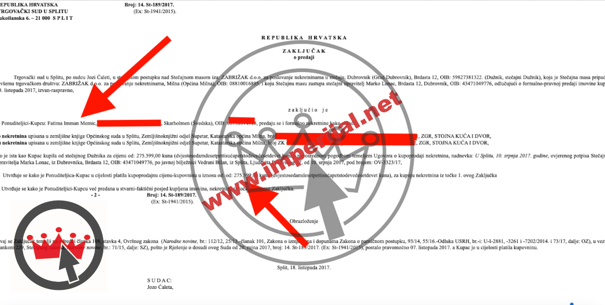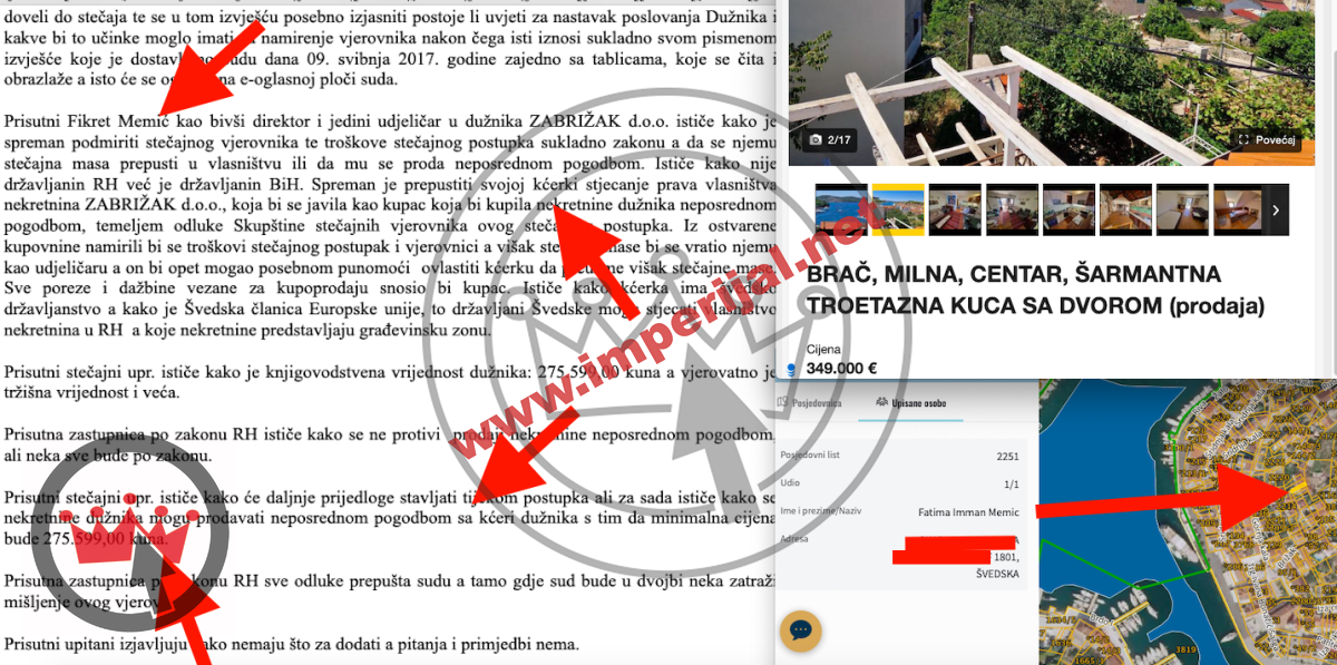 Prisutna zastupnica po zakonu RH sve odluke prepušta sudu a tamo gdje sud bude u dvojbi neka zatraži mišljenje ovog vjerovnika. Prisutni upitani izjavljuju kako nemaju što za dodati a pitanja i primjedbi nema.' - piše na kraju tog dokumenta. Potom je u listopadu 2017. Fatima Imman Memić kupila nekretninu na Braču od tvrtke Zabrižak u stečaju po cijeni koju je njen otac Fikret Memić i predložio u stečajnom postupku na Trgovačkom sudu u Splitu. Netom je tu kuću Memićeva kći Fatima Imman Memić oglasila preko Njuškala na prodaju - LINK. Oglašena je kao: 'BRAČ, MILNA, CENTAR, ŠARMANTNA TROETAŽNA KUĆA SA DVOROM (prodaja)' i to po cijeni 349.000 €.