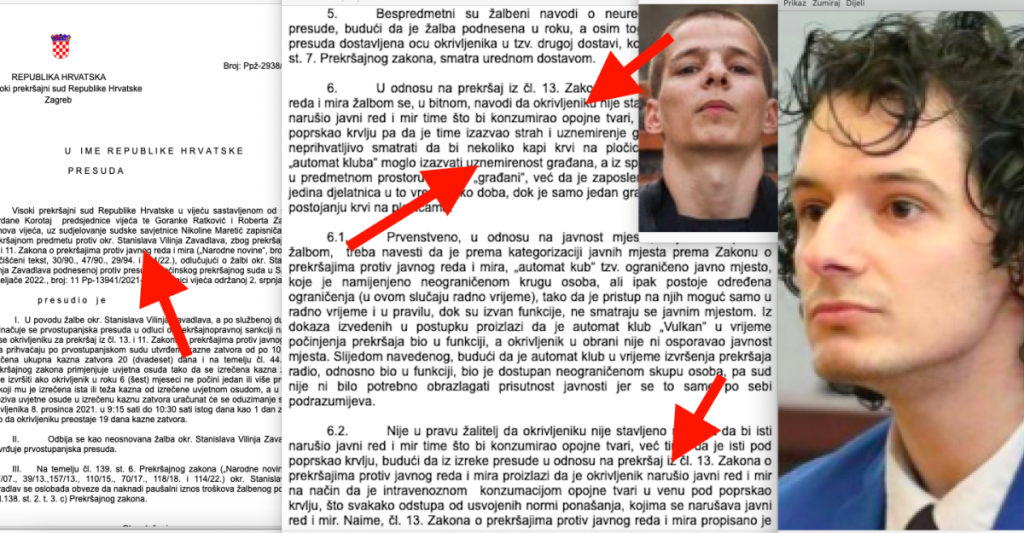 U bazi presuda Ustavnog suda nalazi se i ona kojom je Zavadlavu 4. lipnja 2024. djelomično usvojena Ustavna žalba i povrijeđeno pravo na djelotvornu sudsku kontrolu zakonitosti produljivanja istražnog zatvora zajamčeno člankom 24. stavkom 3. Ustava RH što možete vidjeti OVDJE. No, ako Giljanovića nije mogao angažirati Filip Zavadlav ipak ga je angažirao njegov brat. Naime, na Visokom prekršajnom sudu RH u Zagrebu 2. srpnja o.g. donesena je presuda po žalbi brata osuđenog višestrukog ubojice Filipa Zavadlava. Odlučilo je vijeće sastavljeno od sutkinje Gordane Korotaj kao predsjednice vijeća te sudaca Goranke Ratković i Roberta Završkog kao članova vijeća. Odlučivali su o žalbi okrivljenog Stanislava Vilinja Zavadlava, zbog prekršaja iz čl. 13. i 11. Zakona o prekršajima protiv javnog reda i mira.