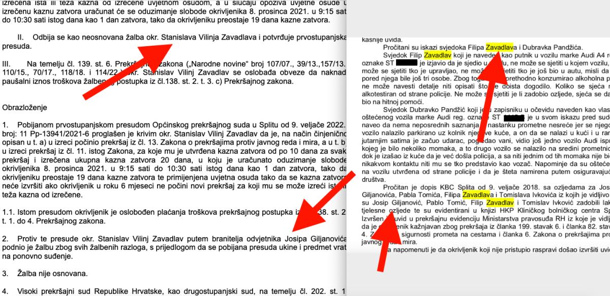 Naime, Zavadlavov brat žalio se na presudu Općinskog prekršajnog suda u Splitu od 9. veljače 2022. godine. Vijeće je donijelo sljedeću presudu: 'I. U povodu žalbe okr. Stanislava Vilinja Zavadlava, a po službenoj dužnosti, preinačuje se prvostupanjska presuda u odluci o prekršajnopravnoj sankciji na način da se okrivljeniku za prekršaj iz čl. 13. i 11. Zakona o prekršajima protiv javnog reda i mira prihvaćaju po prvostupanjskom sudu utvrđene kazne zatvora od po 10 dana i izrečena ukupna kazna zatvora 20 (dvadeset) dana i na temelju čl. 44. st. 1. Prekršajnog zakona primjenjuje uvjetna osuda tako da se izrečena kazna zatvora neće izvršiti ako okrivljenik u roku 6 (šest) mjeseci ne počini jedan ili više prekršaja za koji mu je izrečena ista ili teža kazna od izrečene uvjetnom osudom, a u slučaju opoziva uvjetne osude u izrečenu kaznu zatvora uračunat će se oduzimanje slobode okrivljenika 8. prosinca 2021. u 9:15 sati do 10:30 sati istog dana kao 1 dan zatvora, tako da okrivljeniku preostaje 19 dana kazne zatvora.