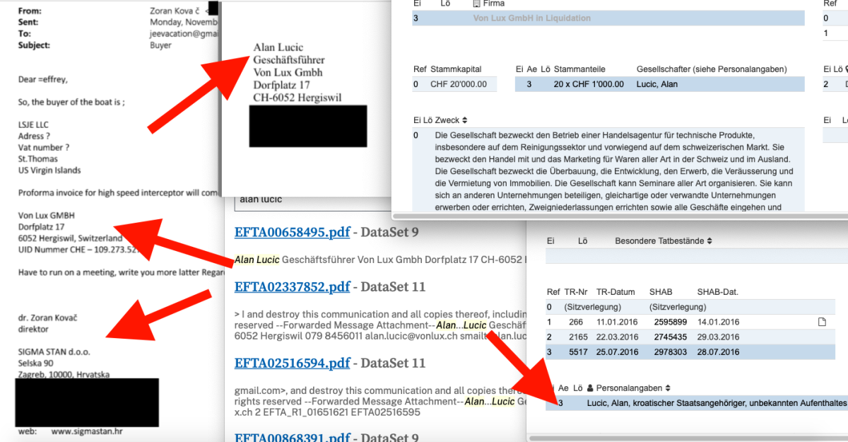Iz razmijenjenih mailova između Epsteina i Kovača vidi se kako je kupac tvrtka koju je pokojni pedofil registrirao na svom privatnom otoku St. Thomas na Američkim Djevičanskim Otocima. Tvrtka se zove LSJE . Što se pak tiče Lučićeve tvrtke Von Lux GMBH vidjeli smo kako je on bio jedini vlasnik i direktor sve do gašenja u travnju 2017. g. Spomenimo kako se radi o mailovima razmjenjivanim i tijekom listopada 2014. g. Tu je i mail od 17. listopada u kojem piše: 'Poštovani Jeffrey, kupac broda je tvrtka LSJE LLC. Adresa i PDV broj su vezani uz St. Thomas, Američki Djevičanski Otoci. Dodatne podatke o registraciji mogu dostaviti po potrebi. Predračun (proforma invoice) za brzi presretač izdat će tvrtka Von Lux GmbH, Dorfplatz 17, 6052 Hergiswil, Švicarska, UID broj CHE-109.273.527. Moram krenuti na sastanak, javit ću se kasnije s više informacija. Srdačan pozdrav, dr. Zoran Kovač, direktor, SIGMA STAN d.o.o., Selska 90, 10000 Zagreb, Hrvatska“, stoji u tom mailu koji možete vidjeti OVDJE.