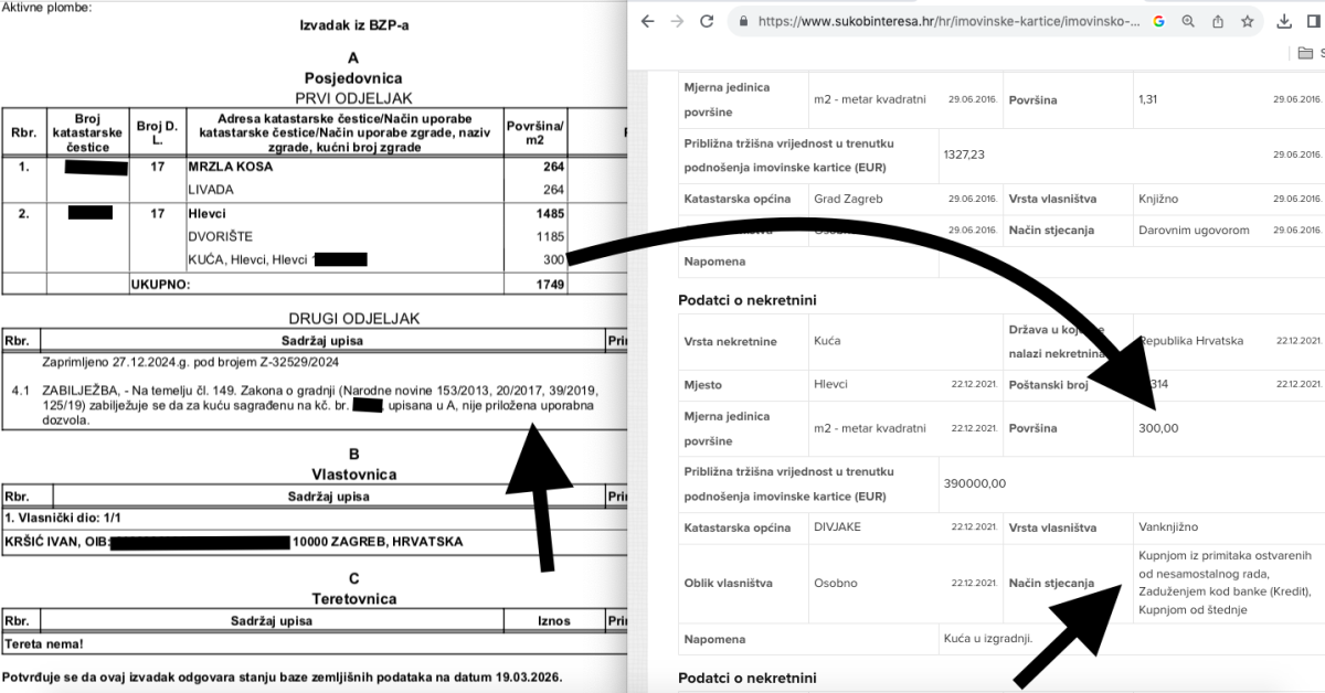 Kršić je obveznik po Zakonu o sprečavanju sukoba interesa pa nas je zanimalo kako je tu imovinu deklarirao. U imovinskoj kartici taj je posjed upisao 22. prosinca 2021. kao kuću u izgradnji površine 300 m2 - LINK. Procijenio ju je na sljedeći način: 'približna tržišna vrijednost u trenutku podnošenja imovinske kartice 390.000 eura'. Kao način stjecanja upisao je 'kupnjom iz primitaka ostvarenih od nesamostalnog rada, zaduženjem kod banke (Kredit), kupnjom od štednje'. Zanimljivo je kako se u povijesnom vlasničkom listu nigdje ne vidi nikakvo kreditno zaduženje u smislu zasnivanja hipoteke neke banke ili financijske ustanove, ali je vidljivo dakle kako nekretnina nema potrebne dozvole. U imovinskoj kartici je naveo i posjed dvije oranice u Hlevcima. Jednu je procijenio na 20.000 eura a drugu na 10.000 eura.