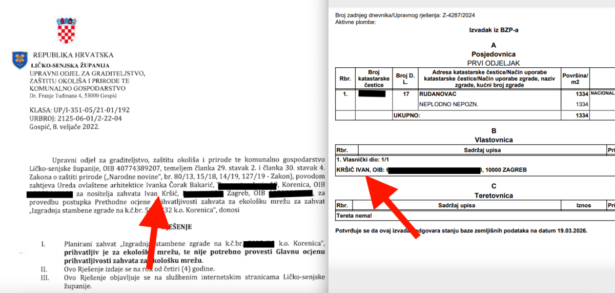 U prosincu 2014. preuzeo je funkciju predsjednika Uprave tvrtke Hidroelektra Niskogradnja d.d., nakon čega je prešao u HŽ Infrastrukturu.'. Kršićev posjed u Hlevcima zapravo se nalazi uz Čarobnu kolibu Ive Todorić. U vlasničkom listu taj je posjed upisan kao: livada 264 m2, dvorište 1185 i kuća 300 m2. U vlasničkom listu piše: 'Zaprimljeno 27.12.2024.g. pod brojem Z-32529/2024 ZABILJEŽBA, - Na temelju čl. 149. Zakona o gradnji (Narodne novine 153/2013, 20/2017, 39/2019, 125/19) zabilježuje se da za kuću sagrađenu na kč. br...., upisana u A, nije priložena uporabna dozvola.'. No, zanimljivo je kako Kršić, koji je prestao biti predsjednik uprave HŽ infrastrukture 13. prosinca 2025. kad je na njegovo mjesto imenovan Zagrepčanin Damir Lončarić, nema niti cent kredita pa je jasno kako je sve financirao gotovinom.