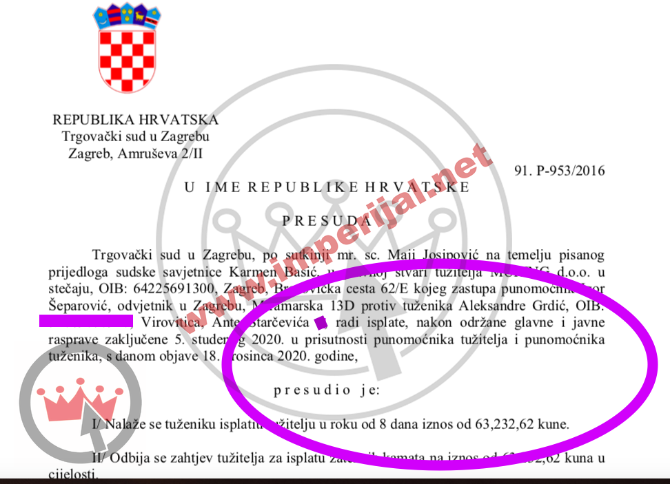 Muring je s Grdićkom 2015. sklopio ugovor o najmu stana i parkirnog mjesta, iako se tuženica u posjedu navedenih nekretnina nalazi i prije, i to od 1. srpnja 2013. godine. Navodi se kako je stvari iz stana iselila tek 16. veljače 2016. Tužbom je Muring uspio dokazati kako Grdićka nije platila ugovorenu najamninu u mjesečnom iznosu od 1.600 kuna, i to za cjelokupno razdoblje u kojem je bila u posjedu nekretnine, a nije plaćala ni režijske troškove za navedeno razdoblje i to za potrošnju plina, vode i struje.