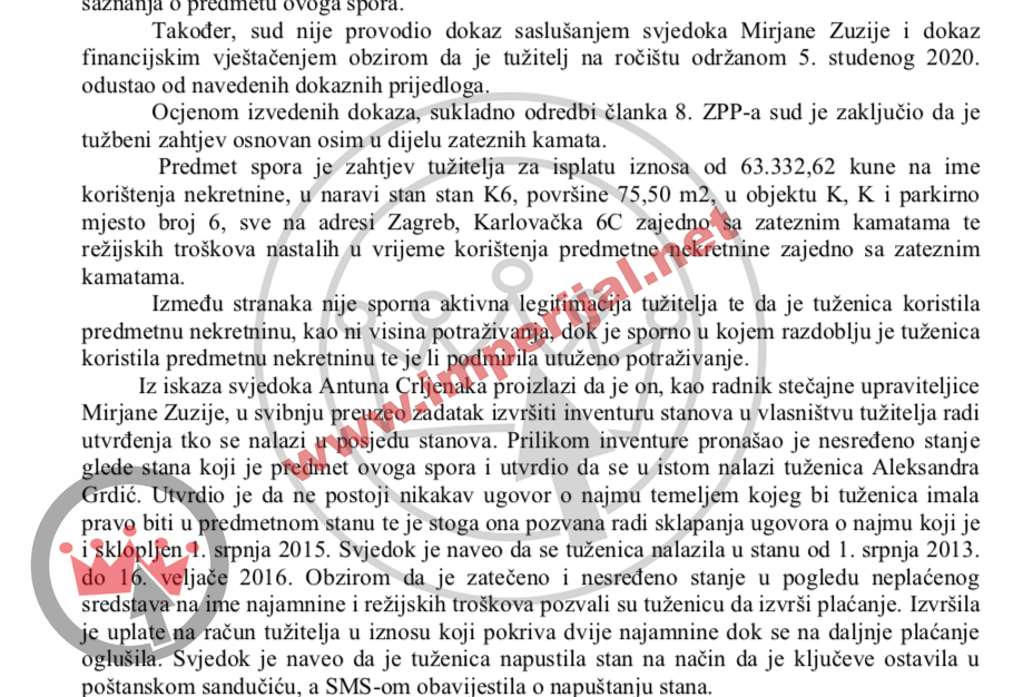 Svjedok je naveo da se tuženica nalazila u stanu od 1. srpnja 2013. do 16. veljače 2016. Obzirom da je zatečeno i nesređeno stanje u pogledu neplaćenog sredstava na ime najamnine i režijskih troškova pozvali su tuženicu da izvrši plaćanje. Izvršila je uplate na račun tužitelja u iznosu koji pokriva dvije najamnine dok se na daljnje plaćanje oglušila. Svjedok je naveo da je tuženica napustila stan na način da je ključeve ostavila u poštanskom sandučiću, a SMS-om obavijestila o napuštanju stana' - piše u sudskom dokumentu.