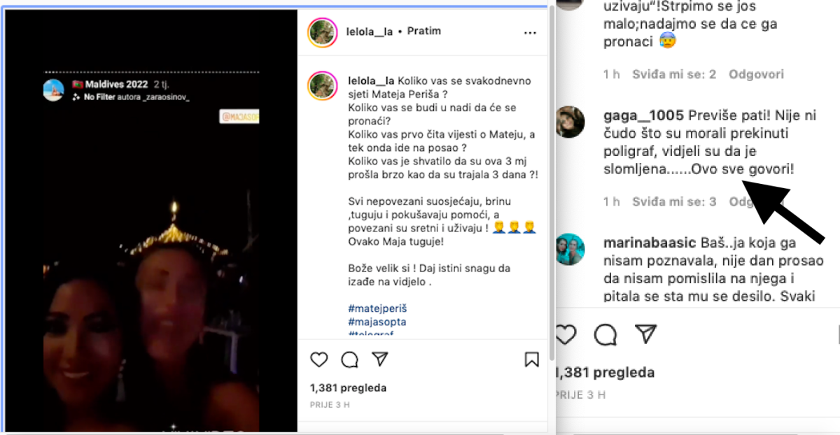 Tamo i svi Instagram korisnici preko ovog linka mogu pogledati kako Maja liječi dušu na Maldivima. Majin nam primjer može puno reći o svijetu u kojem živimo. Puno više od službenih rekonstrukcija događaja, priopćenja o predanosti i profesionalno i dosljedno obavljenoj dužnosti. Djeca godine provedu u školskim klupama da bi, kada izađu iz njih, shvatili kako svijet koji ih okružuje ima sasvim drugu dinamiku i pravila od onoga što su godinama učili. Zbog toga maldivski ples i maldivske brodske zabave Maje Sopte govore kako u svijetu koji nas okružuje postoji puno ljubavi kod anonimnih ljudi dobre volje koji žele povratak Mateja i sreću njegovoj obitelji. Koji su s Matejem i Perišima u mislima i molitvama i u svojim nadanjima. No, postoji i svijet kojega je očito dijelom bio i sam Matej Periš a koji naravno ima pravo misliti kako se život ne završava nečijim nestankom ili, kako je to rekao splitski odvjetnik, trenutkom kada neka osoba bude dematerijalizirana.