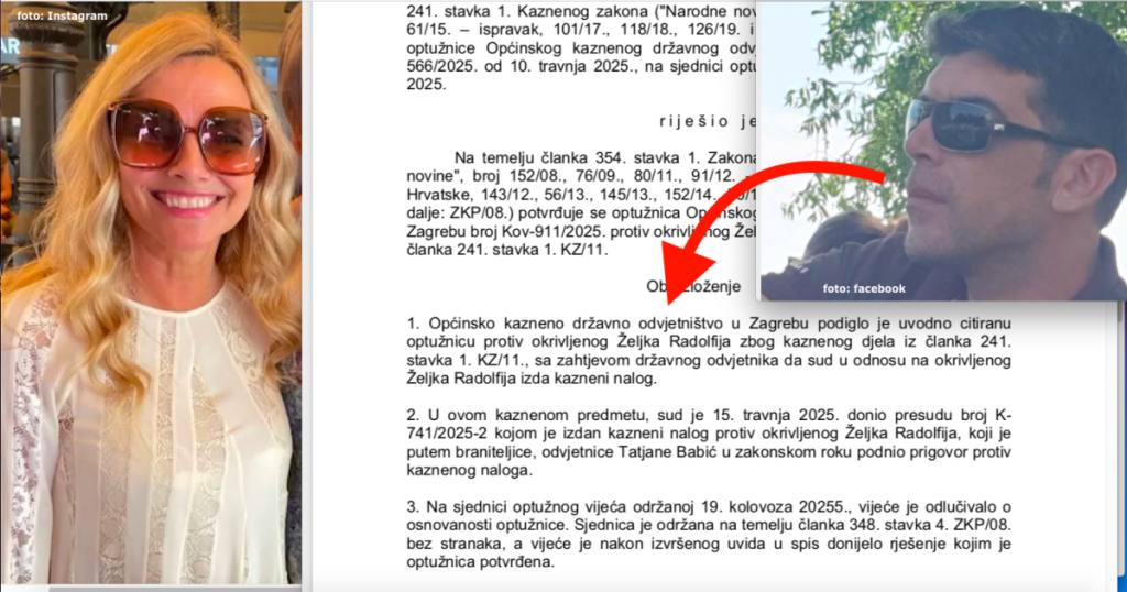 Citiramo iz dokumenta: 'U ovom kaznenom predmetu, sud je 15. travnja 2025. donio presudu broj K-... kojom je izdan kazneni nalog protiv okrivljenog Željka Radolfija, koji je putem braniteljice, odvjetnice Tatjane Babić u zakonskom roku podnio prigovor protiv kaznenog naloga. Na sjednici optužnog vijeća održanoj 19. kolovoza 20255., vijeće je odlučivalo o osnovanosti optužnice. Sjednica je održana na temelju članka 348. stavka 4. ZKP/08. bez stranaka, a vijeće je nakon izvršenog uvida u spis donijelo rješenje kojim je optužnica potvrđena. Prilikom ispitivanja optužnice, vijeće je istu ispitivalo sukladno odredbi članka 542. stavka 4. ZKP/08. pri čemu će optužno vijeće optužnicu ispitati prema članku 542. stavku 5. ZKP/08. odnosno u smislu članka 344. stavka 1. točke 1., 3. i 5. ZKP/08. i je li optužnica podignuta na temelju vjerodostojne kaznene prijave.