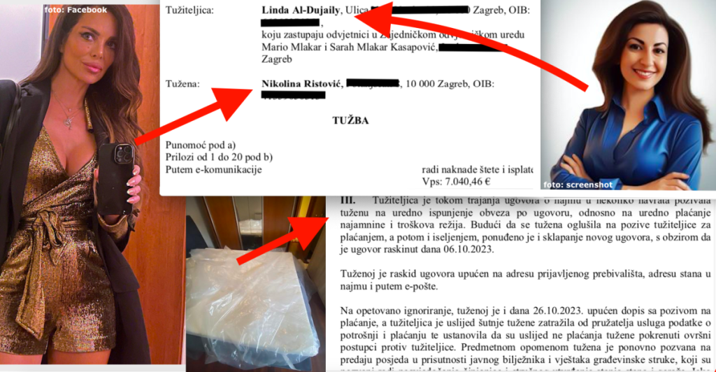 Na Općinski građanski sud u Zagrebu dospjela je tužba Zagrepčanke Linda Al-Dujaily. Protiv tuženice Nikoline Ristović pokrenut je spor 'radi naknade štete i isplate' procijenjen na 7.040,46 €. U tužbi piše kako je tužiteljica vlasnica četverosobnog stana površine 117,49 m2 s garažom i to u jednoj ulici koja se križa s elitnim Pantovčakom. U tužbi piše kako su 'tužiteljica i tužena 3. lipnja 2022. sklopile Ugovor o najmu stana i garažnog mjesta te to ovjerile istog dana kod javne bilježnice Tihane Sudar iz Zagreba. Ugovor je raskinut '6. listopada 2023. s obzirom da tužena nije ispunjavala obveze preuzete predmetnim Ugovorom'.