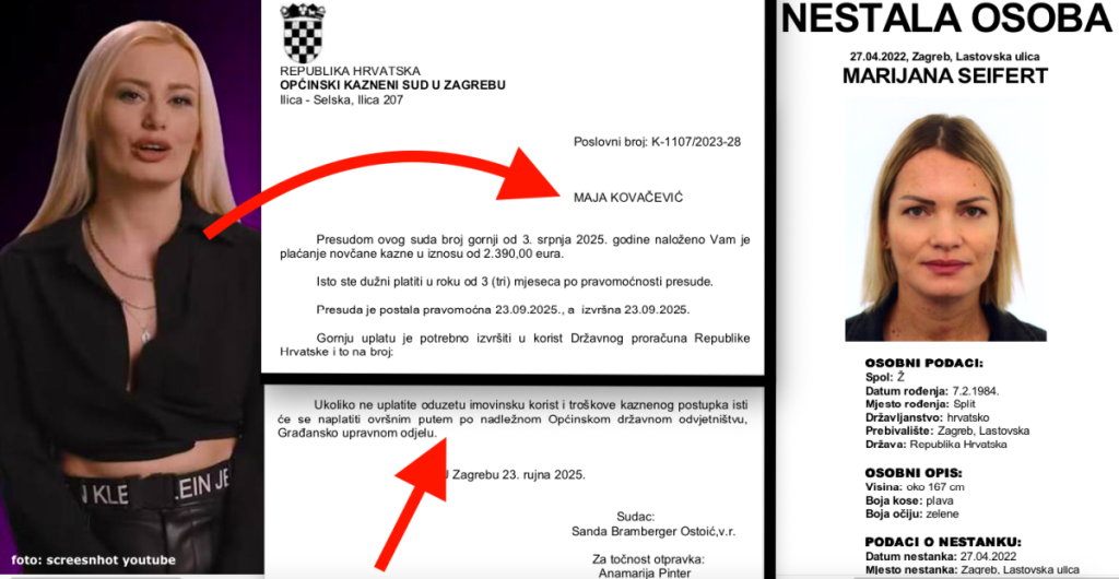 Tako piše: 'Presudom ovog suda broj gornji od 3. srpnja 2025. godine naloženo Vam je plaćanje troška kaznenog postupka u iznosu od 100,00 eura. Isto ste dužni platiti u roku od 15 (petnaest) dana po pravomoćnosti presude. Presuda je postala pravomoćna 23.09.2025., a izvršna 23.09.2025....'. Iz navedenog je vidljivo kako taj iznos od 100 eura dospijeva već ovog mjeseca. Na kraju je Maji istaknuto upozorenje: 'Ukoliko ne uplatite oduzetu imovinsku korist i troškove kaznenog postupka isti će se naplatiti ovršnim putem po nadležnom Općinskom državnom odvjetništvu, Građansko upravnom odjelu.'. Inače, presudu sestri nestale Marijane Seifert izrekla je ista sutkinja Općinskog kaznenog suda u Zagrebu, Sanda Bramberger Ostoić.