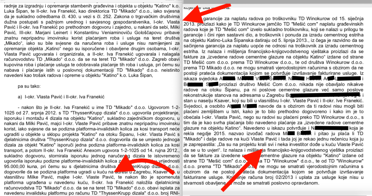 Optužnica kojom se Pavić i druge dvije okrivljenice terete za malverzacije teške 761.146,84 kuna, odnosno u protuvrijednosti 101.021,55 eura otkriva kako su na teret i novcem ruskog tajkuna Vlasta Pavić i njene ortakinje uređivale vlastite nekretnine. Tako je primjerice Vlasta Pavić ugradila dizalo za invalide u stan svojih roditelja a za isto teretila tvrtku Mikado. Također, za 600.000 kn poznati zagrebački građevinar i vlasnik tvrtke koja je izrasla u doba pokojnog gradonačelnika Milana Bandića, uredio je Pavićkine privatne kvadrate a sve je platila tvrtka Putinovog intimusa. Iz optužnice se vidi i kako su kupovane skupe kuhinje i namještaj kao i dekorativni kamen a sve je završilo u domovima triju optuženica. No, to nije sve.