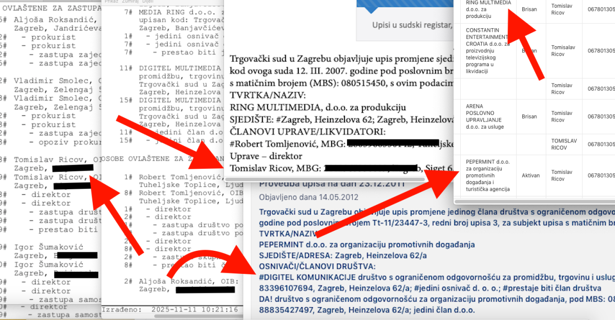 Tomislav Ricov je, primjerice, u ožujku 2007. direktorsku funkciju preuzeo od Roberta Tomljenovića - link, a potom je na njegovo mjesto u listopadu 2008. imenovan Igor Šumaković - link. No, tu se samo izmjenjivali isti članovi ekipe što se vidi iz činjencie da je Šumakovića u travnju 2009. na poziciji direktora naslijedio ponovno Tomljenović - link. Zanimljivo je kako je Multimedia Ring 2013. pripojena tvrtci Ujedinjene produkcije - link. Tu su tvrtku osnovale Digitel komunikacije i u njoj su redom direktori bil: Vladimir Smolec, Aljoša Roksandić, Vladimir Šelebaj - Sellier, Hrvoje Bošnjak, Dario Vince, Vedran Perišić i Tibor Gojun. Šelebaj - Sellier je bivši muž Dijane Čuljak koji je skupa s njom osuđen u aferi Core Media.