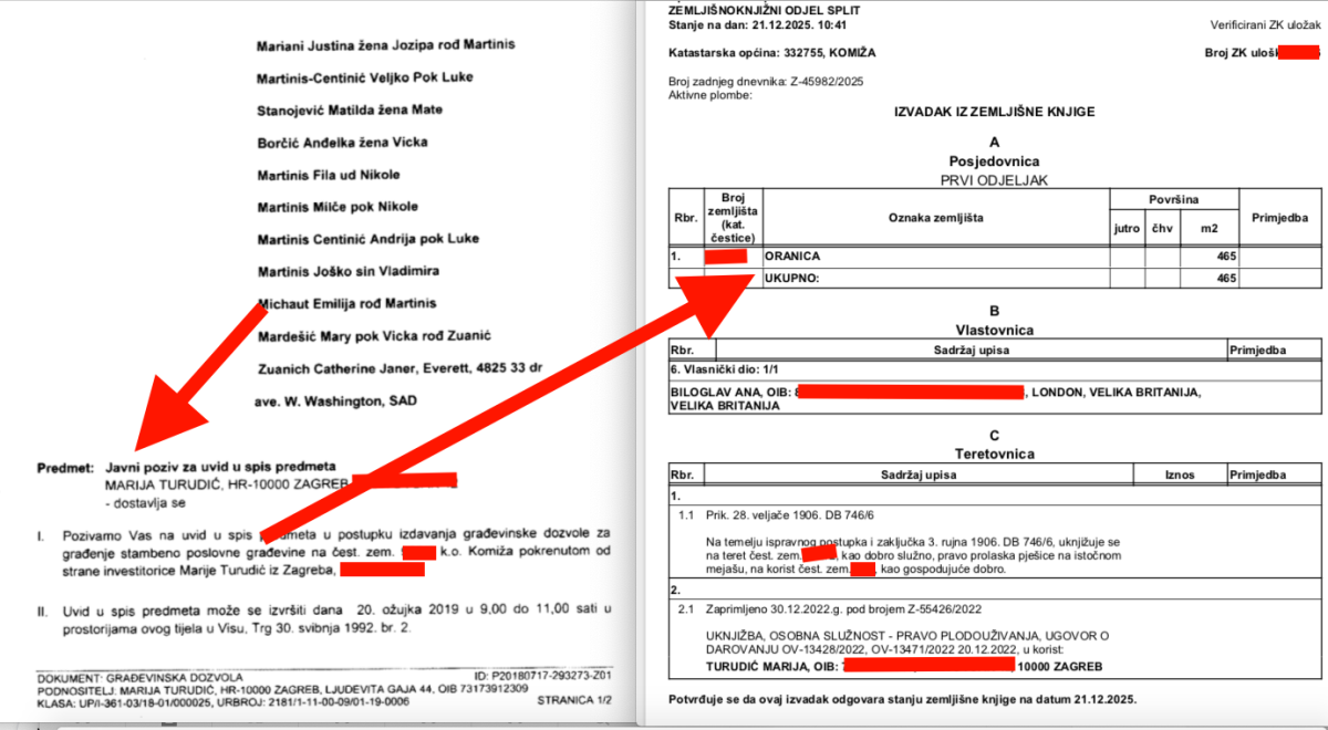 No, istražujući podatke za ovu temu pronašli smo podatak koji nas je naveo na zaključak kako je ona izgradila vilu u Komiži a potom ju prenijela na kći. Naime, nadležni splitski ured izdao je u ožujku 2019. Javni uvid u spis predmeta u kojem se vidjelo kako je ona investitorica na toj čestici na kojoj sada stoji moderna ljetna rezidencija koja glasi na njenu kćer. Tada su oglasom pozvani vlasnici susjednih parcela, osobe prezimena: Martinis, Michaut, Mardešić,Mariani, Zuanich, od kojih su neki živjeli i u New Yorku. U dokumentu je pisalo: 'Pozivamo Vas na uvid u spis predmeta u postupku izdavanja građevinske dozvole građenje stambeno poslovne građevine na čest. zem. ... k.o- Komiža pokrenutom od strane investitorice Marije Turudić iz Zagreba, .... l. Uvid u spis predmeta može se izvršiti dana 20. ožujka 2019 u 9,00 do 11,00 sati prostorijama ovog tijela u Visu...'.