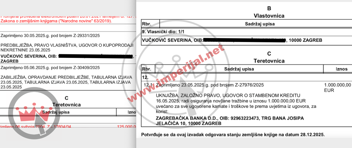 Izgledno je, da će zbog svega navedenog, i Severina jednog dana, ako se odluči na prodaju svoje nove vile, po kupca moći ići i izvan granica RH. Inače, Severina je vilu uknjižila 23. svibnja ove godine. U vlasničkom listu upisan je hipotekarni zajam od milijun eura u korist Zagrebačke banke. Malo ranije, odnosno 16. svibnja o.g., potpisala je i stambeni zajam. No, s obzirom da se vila prodavala za skoro dvostruki iznos pa je snižena na 1,7 miijuna dolara vjerojatno je Severina morala posegnuti u džep i dio platiti i gotovinom.
