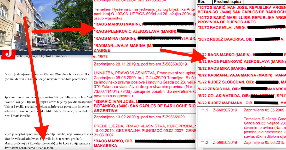 Tu je i drugi ČLANAK: 'NESREĐENE HR GRUNTOVNICE Mama premijera Plenkovića nakon 18 godina procedure uknjižila 2 oranice s 52 vlasnika'. U podnaslovu je tada navedeno: 'Baka šefa hrvatske Vlade Mila Raos rođ. Sisarić umrla je 2003. u dobi od 83 godine ali trebalo je skoro dva desetljeća da se njezina djeca upišu u vlasnički list'. U tom su članku spomenuti i njen brat Marko Raos i sestre Mira Raos iz Makarske te Marina Radman - Livaja koja živi u Zagrebu. No, tada nismo znali kako su se premijerova mana, njene sestre te brat Marko Raos uspjeli uknjižiti i na nekretnine u srcu Zagreba, u višekatnici u Ulici Ivana Kukuljevića 26 u Zagrebu i to upravo u zgradi koju u povratu potražuju i nasljednici pokojnog poglavnika NDH Ante Pavelića. Uknjižili su se na jednu etažu u travnju 2004. temeljem rješenja o nasljeđivanju. No, kasnije su provedene i druge uknjižbe na njihovo ime u istoj zgradi.