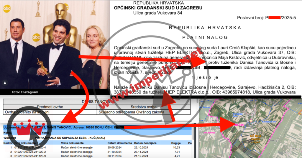 Uz Tanovićevo ime navedena je adresa njegovog hrvatskog prebivališta, ulica u prigradskom naselju Donji Čehi u Novom Zagrebu. Zanimljivo je kako kućni broj koji se navodi u papirima nismo uspjeli pronaći u samoj toj ulici u Donjim Čehima koja inače ima čudan model numeriranja objekata pa tako, primjerice, nakon kućnog broja 5 s ulične strane slijedi broj 11. Nije isključeno da je kuća koja nosi broj, a za čiji se neplaćeni račun tereti Tanovića, neka od dvorišnih koja nije vidljiva s ulične strane. Bilo kako bilo, zagrebačka je sutkinja, izvan ročišta 7. siječnja 2026. naložila tuženiku Danisu Tanoviću da tužitelju HEP Elektri d.o.o. iz Zagreba nadoknadi dug 'na temelju vjerodostojne isprave', odnosno izvatka iz poslovnih knjiga.
