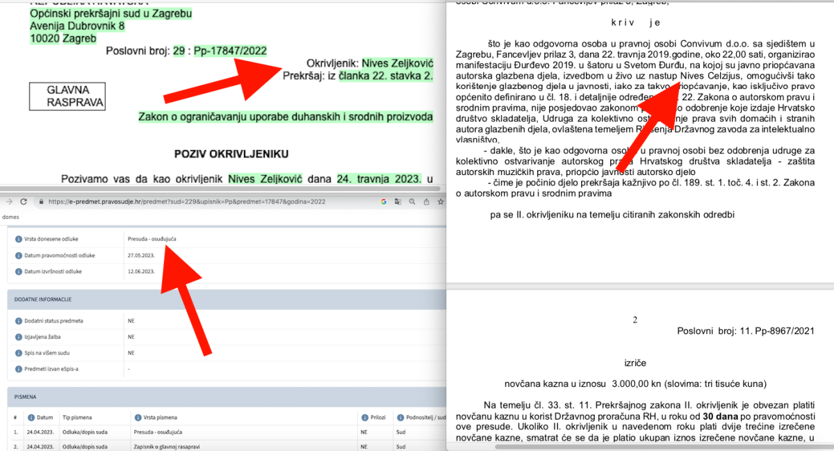 Naime, proglasila je krivim prethodno osuđivanog Dragana Barbarića iz Ludbrega, direktora i odgovornu osoba te tvrtke i to zbog organizacije koncerta Nives Celzijus u šatoru u Đurđevcu. U presudi piše da je Barbarić proglašen krivim 'što je kao odgovorna osoba u pravnoj osobi Convivum d.o.o. sa sjedištem u Zagrebu, Fancevljev prilaz 3, dana 22. travnja 2019.godine, oko 22,00 sati, organizirao manifestaciju Đurđevo 2019. u šatoru u Svetom Đurđu, na kojoj su javno priopćavana autorska glazbena djela, izvedbom u živo uz nastup Nives Celzijus, omogućivši tako korištenje glazbenog djela u javnosti, iako za takvo priopćavanje, kao isključivo pravo općenito definirano u čl. 18. i detaljnije određeno u čl. 22.