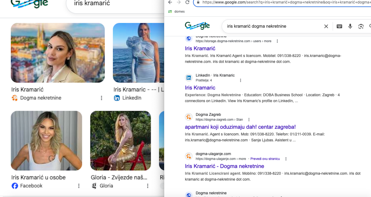 No, otkad je uhićena uklonjen je link koji je vodio na nju kao agenticu te tvrtke i sad je dostupan samo onima koji incijalno upišu na Google tražilicu njeno ime te naziv Dogma nekretnine. Na Google slikama još je vidljiva njena slika s morskom panoramom koja je egzistirala na webu Dogma nekretnina ali ni tu stranicu više nije moguće učitati jer su ju administratori u međuvremenu uklonili. Da radi i za Dogma nekretnine osim za vlastitu tvrtku Life Journey Iris Kramarić je isticala i na LinkedInu ali i ta je stranica u međuvremenu uklonjena. No, još su na Googleu dostupni brojni oglasi iz kojih se vidi kako je trgovala brojnim nekretninama kako na moru tako i u Zagrebu radeći za Dogma nekretnine. Iris Kramarić bila je navedena kao agentica i Dogma Beograd ali kada danas kliknete na taj link samo vam se učita kako stranica nije pronađena.