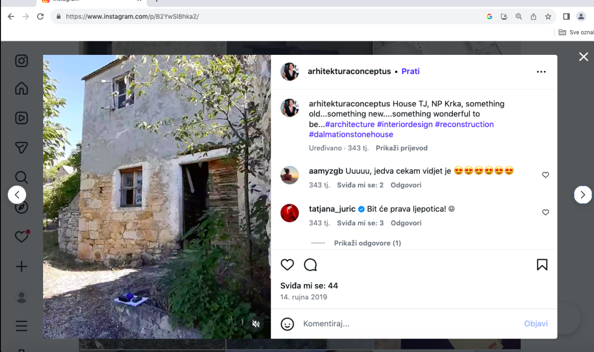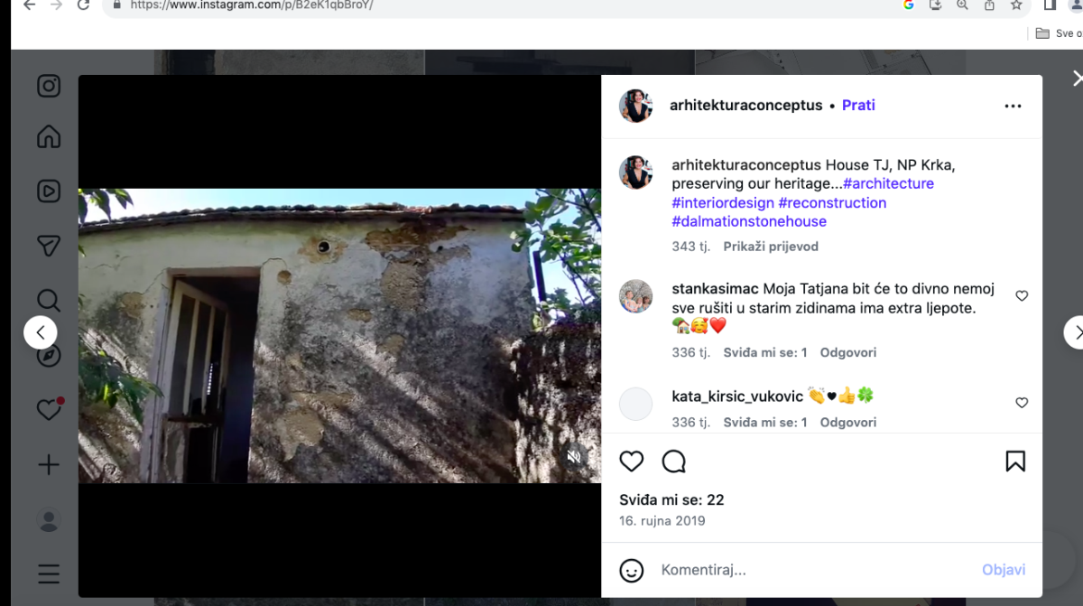 Stoga ne čudi da je Tatjana Jurić upravo takvom uredu povjerila projekt obnove svoje kamene starine na djedovini, u selu Dubravice kraj Skradina. Na Instagram profilu arhitekturaconceptus pronašli smo dvije objave iz rujna 2019. g., dakle prije 343 tjedna, sa snimkama stanja kuće Tatjane Jurić na djedovini. U IG objavi arhitektica Babić je napisala: 'house TJ, NP Krka, preserving our heritage...', dakle očuvanje našeg nasljeđa, baštine. Jedna komentatorica je napisala: 'Moja Tatjana bit će to divno nemoj sve rušiti u starim zidinama ima extra ljepote'. Na snimci su se vidjele godine napuštenosti i propadanja kamenih starina pa tako i vlažni, derutni zidovi obrasli plijesni, propale međukatne deke od trske tako da pogled iz sobe seže na krov, odnosno crijep...