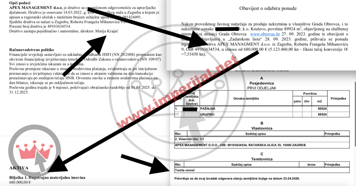 - Prema podacima sa Sudrega suvlasnik ste tvrtke Apex Management zajedno s austrijskom tvrtkom RAUCHHAUS Immo & Invest GmbH u vlasništvu Andreasa Christiana Kühbergera. Ta tvrtka vlasnica je parcele površine 89924 m2 na području Kruševa kupljene u rujnu 2023. na javnom natječaju od Grada Obrovca. S obzirom da ste suvlasnik te tvrtke od rujna 2024. g. zanima nas koliko ste platiti suvlasništvo s obzirom na činjenicu da je ista upisana s aktivom od 680.000 eura, koliko je plaćeno navedeno zemljište?